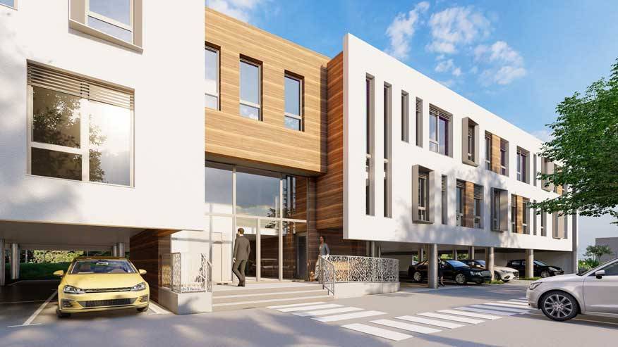 Imaginé par le cabinet d’architecture marseillais Arfen, l’immeuble – répondant à la réglementation RE2020 – propose 1 800m² de bureaux modernes et fonctionnels, sur deux niveaux.