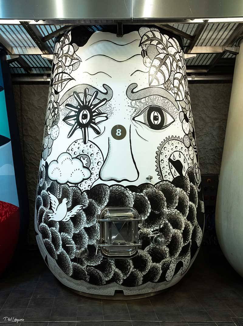 « La cuvée 2019 a nécessité un grand écart dans la quête de l’équilibre des Carmes Haut-Brion. Qui, mieux que Bacchus, dieu du vin, du théâtre et de la tragédie, pouvait incarner de tels rebondissements et l’infatigable génie humain ? J’ai mis ma technique de « l’encre caviar » au service d’un visage mature, dont la chevelure constellée de grains de raisin, de pampre et de figuier rappelle Arcimboldo et l’Italie. Ce visage de dieu « tatoué » est un clin d’oeil à l’art urbain, aux mangas japonais et à la bande dessinée de mon enfance. Des symboles parsèment cette cuve-totem, faisant allusion aux caprices des saisons, à la maturation du breuvage et aux qualités ésotériques du vin. Il est une fois encore question de magie et de spiritualité pour cette édition 2019. Bacchus au regard magnétique, extralucide, aura pour mission d’incarner le gardien du temple, « l’esprit des lieux » de cette crypte somptueuse ». Gwendoline Finaz de Villaine