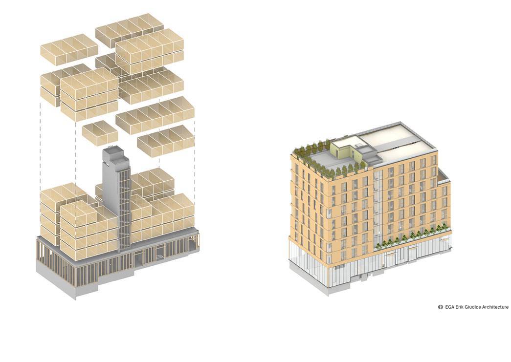 La résidence sociale étudiante est réalisée à 90 %, avec des modules préfabriqués en bois, imaginés par EGA-Erik Giudice Architecture spécialement pour le projet du GROUPEMENT PICHET-LEGENDRE.
